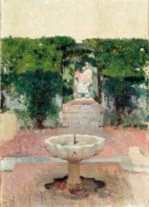El recorrido se centra en la relación de Sorolla con los jardines históricos del Alcázar, donde el artista trabajó en varias campañas entre 1908 y 1918. Espacios como el Jardín de Troya, el Jardín de las Flores, el Estanque de Mercurio, los Jardines de Carlos V o el Jardín de las Damas se convierten en protagonistas de una pintura que explora la luz, el agua, la cerámica, las sombras y la vegetación como auténticos “salones al aire libre”. Las albercas, fuentes, setos recortados y naranjos cargados de fruto se transforman en laboratorios de color donde el pintor experimenta con reflejos, encuadres y cambios de atmósfera a lo largo del día.